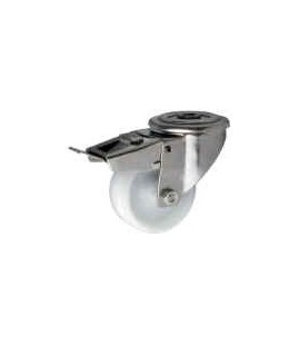Platine inox renforcée (épaisseur 5 mm) pivotant sur un double chemin de billes traité. Roue en polyamide renforcé coloris blanc. Roulette supportant de très lourdes charges.