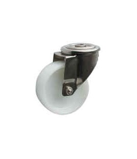 Roulettes polypropylène chape à œil inox. Platine pivotant sur un double chemin de billes. Roue en polypropylène coloris blanc. Charge dynamique : 100 Kg