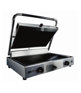Plaque supérieure rainurée / inférieure lisse Puissance : 2000 Watts. Dimensions : L600 x P410 x H170 mm. Surface utile: 510 x 280 mm. Poids: 21 Kg 2 Thermostats de chaleur 300°C. 2 SWITCH on/off. 2 Voyants de contrôle.