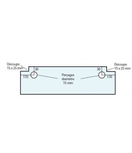Vitre de four de boulangerie adaptable sur four PAVAILLER. 2 trous (ø de perçage 15 mm). entraxe bord vitre-trou : 50 mm.entraxe haut vitre-trou : 181 mm. 1 découpe latérale à droite : 23 x 23 mm. épaisseur : 5 mm.