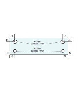 Vitre de four de boulangerie adaptable sur four FRINGAND, 2 trous (ø de perçage 14 mm). Entraxes: - bord vitre-trou : 95 mm. - haut vitre-trou: 30 mm. Epaisseur : 6 mm