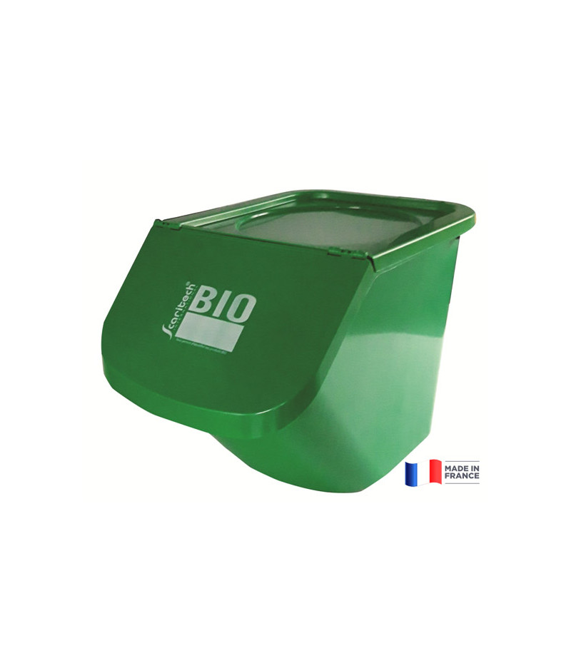 Conteneurs 40L vert marquage BIO sans couvercles, L450 x lg610 x H 450mm, poids 2130g, fabrication française. Polypropylène.