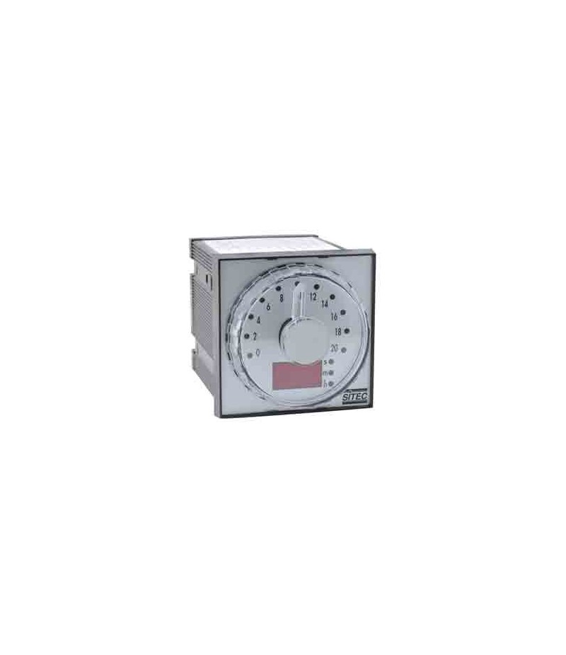 Cadran gradué de 0 à 10 . 3 gammes : secondes, minutes ou heures. 1 led devant chaque chiffre. 1 affichage digital 3 chiffres. Alimentation 24 V /DC 50/60 Hz. 1 entrée start + 1 entrée mémoire comptage. 2 relais de sortie in