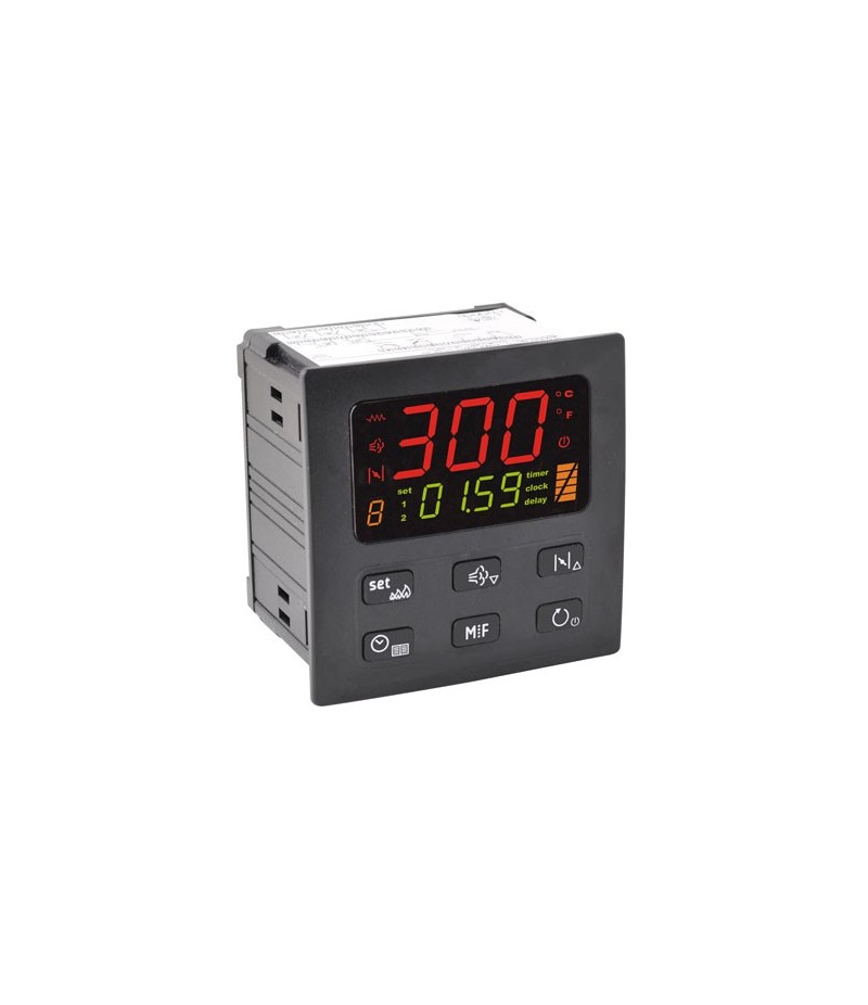 Livré sans sonde (exemple régulation voûte et sole). Indication par 2 afficheurs digitaux à 3 chiffres. Panneau frontal compact 96 x 96 mm en matériau composite. Boîtier profondeur 65 mm. Touches en silicone à haute sensibilité avec marquage net du contact. Précision 0,5%. Etanchéité IP65. * Alimentation 230 V.* 2 entrées thermocouple J ou K, livré configuré en TCJ (sondes non livrées).* Touche multifonction en façade actionnant un relais permettant de connecter une électrovanne (temps d'ouverture réglable) ou l'éclairage ou un extracteur, ...* Touche de mise en veille en façade permettant l'extinction complète du four ou de l'étage.* Multigamme de température de 0 à+999°C (livré configuré en 0/300°C).* Hystérésis (∆T) réglable. * Calibration de l'affichage réglable. * Réglage de la température à vitesse exponentielle permettant d'atteindre la consigne très rapidement.* Borniers arrières individuels débrochables. * Mini étriers latéraux avec vis intégrées permettant un serrage et une fixation efficace du régulateur.