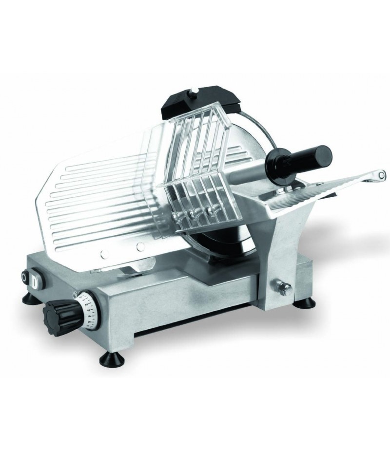 Equipé d'une lame en acier inox inoxydable anti- adhésive garantie 6 ans contre la corrosion conformément à la directive Rohs 2002/95. Entraînement par courroie bâti en aluminium anodisé avec traitement pour l'alimentation selon les directives communautaires en vigueur conformes à la norme sur les trancheurs professionnels en 1974. Interrupteur 24 V à deux boutons avec réarmement - chariot fixe - monté sur pieds ventouses - affûteur intégré en aluminium - chariot équipé d'un protège mains - sécurité de non redémarrage - adapté pour les bars, brasseries, sandwicheries, petites restaurartion - alimentation : 230/1/T à lame : 250 mm. Coupe utile : 210 x 170 mm. Puissance : 160 W. Dimensions (lxpxh) : 510 x 420 x 390 mm.